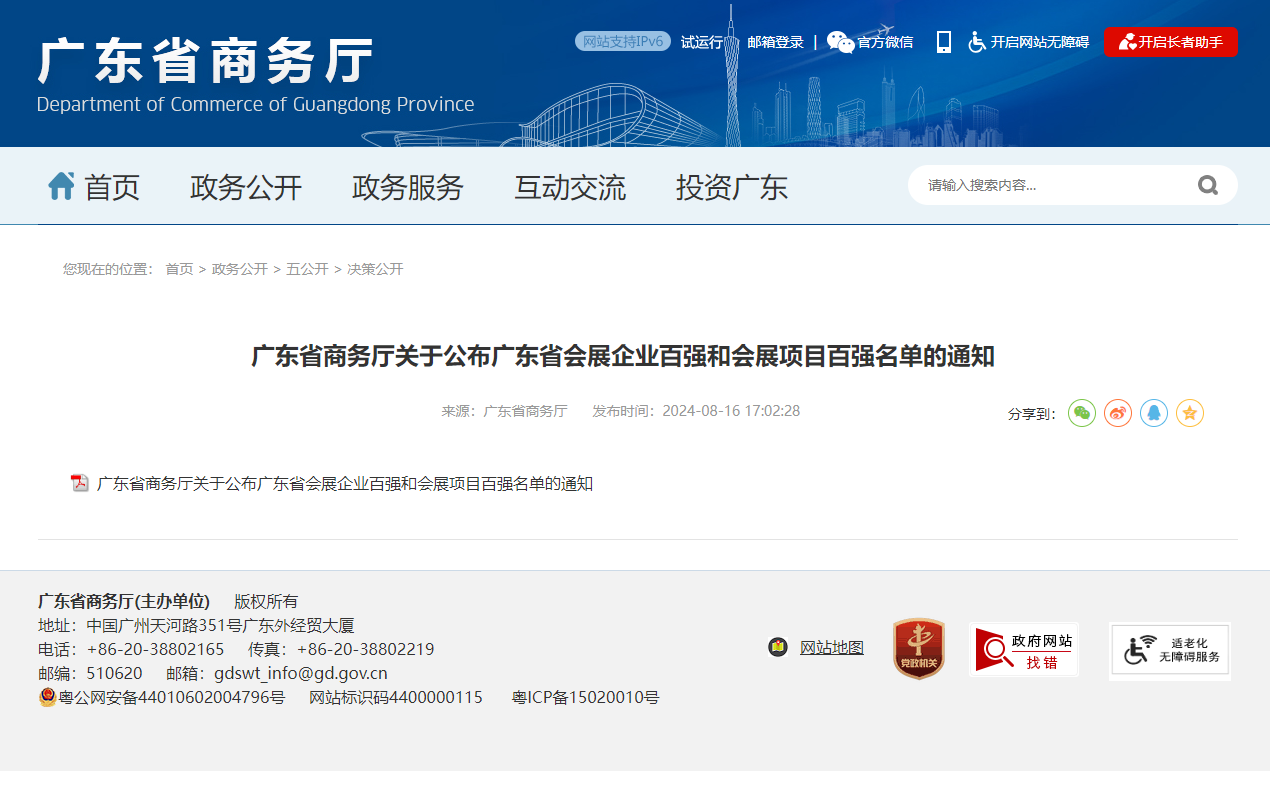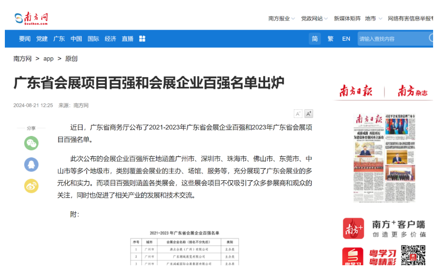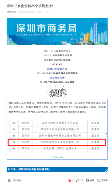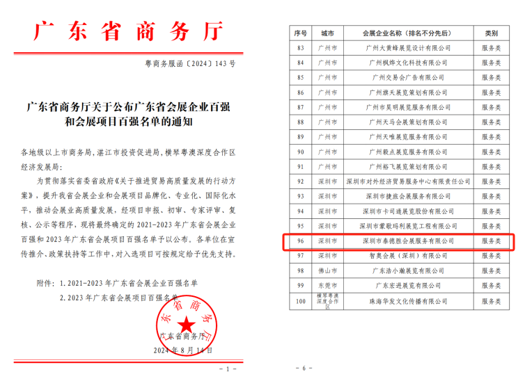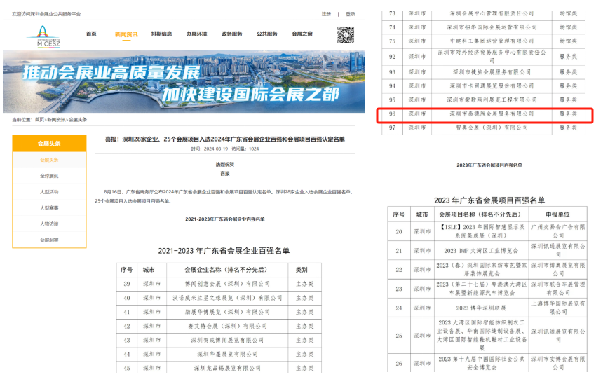 泰德胜会展同时国际展览物流协会的中国区会员,这是世界最专业的展览及会展的物流行业协会,为展商在全世界不同地区参展保驾护航。泰德胜全体同仁将继续以专业的经验,合理的时间把控,服务国内外展商,共同开拓新的机遇。 以下是各官方渠道及报章网站对广东省会展企业百强的公布和报道: 广东省商务厅网站关于会展百强企业的宣传: